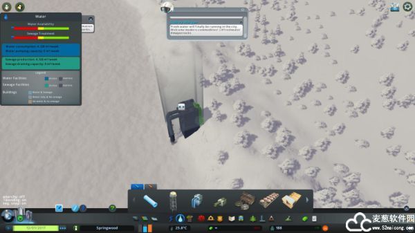 4、下图所示图标代表水资源匮乏;解决的方法就是在在水资源列表里点击水塔或中转站,并将它安装在水源附近;