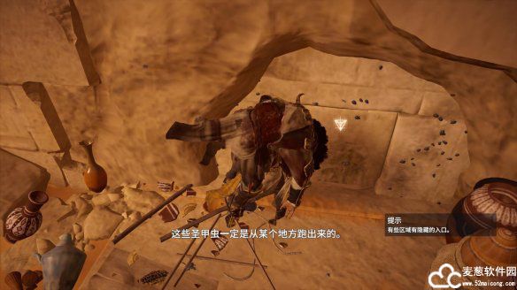 与赫帕托斯的战斗发生在一处密封的“竞技场”内。长按住V可以使用“Animus”脉冲,能够探得周边区域内可以互动的物件。在这个区域使用,即可在一个角落探寻到一面可以互动的暗门,从这里离开。