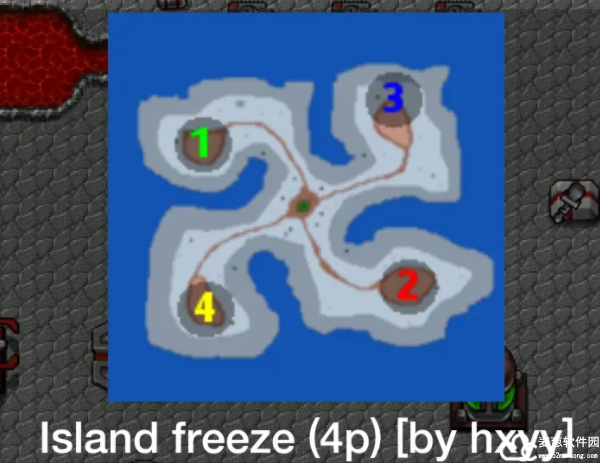 因场地开阔,矿点众多,适合运用机动性较高的陆军和空军抢夺或打击资源点。开局机械场小机甲,开局陆地工厂出小坦或主力坦克,空军基地出轻武直或武直,均是不错的选择。在上图中,整体陆地面积较大,空军机动性优势明显,有不错的发挥。而下图的陆地面积仍不足以发挥空军优势,再结合性价比等原因,最适宜打法是开局二级工厂出主力坦克。(备注:沙漠地图和island freeze的地图面积大小可作为空军以及一些低科技兵种使用效率的临界点。临界点上方开始,小坦克等低科技高产出效率的兵种和空军开始适宜使用)(具体原因1:低科技兵种产出前提低,可以迅速出来干扰战场,压制建造者建造野矿或压制击杀对面在野侦查者,而本方建造者可以安然建造资源点获得经济优势,而过多制造低级兵种会影响性价比更高的二级工厂主力坦克产出到达前线资源点,即而被反制。具体情况应结合地图大小判断,上述地图提供了一个临界值。)(具体原因2:地图面积越大,矿点越多,空军能控制骚扰的地点就越多。而空军的劣势即性价比大部分低于陆战对空兵种,若资源点较少且集中于一处,在重坦等主力陆军到达矿区夺取经济然后后起空军反制会陷入劣势,甚至基地亦会受到坦克群威胁)