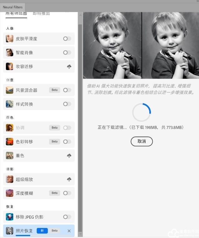 1、导航至文件 > Neural Filters > 所有滤镜。选择 Beta 部分下照片恢复的下载云图标以启动下载,然后启用该滤镜。